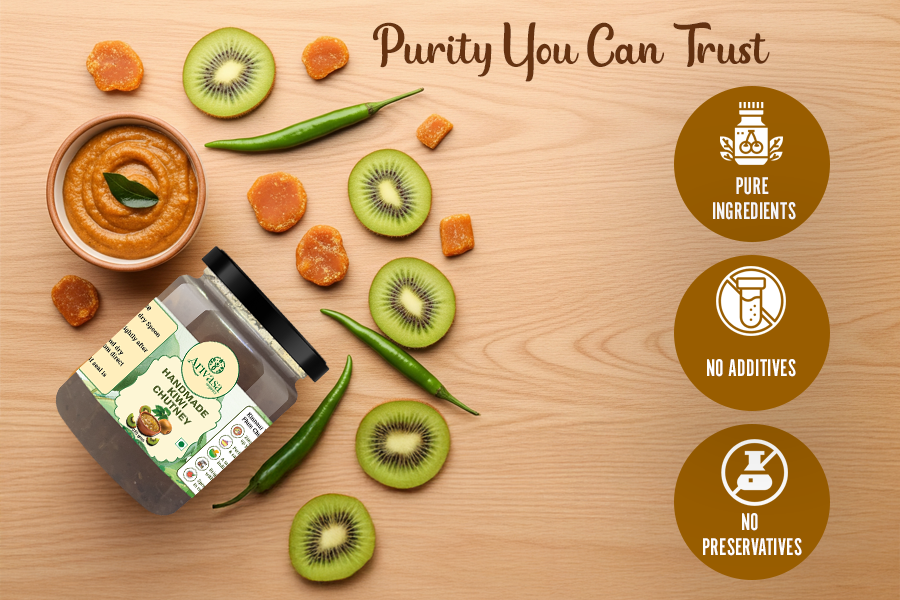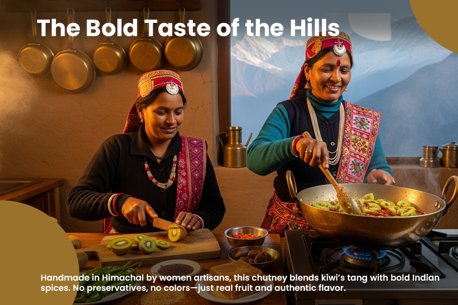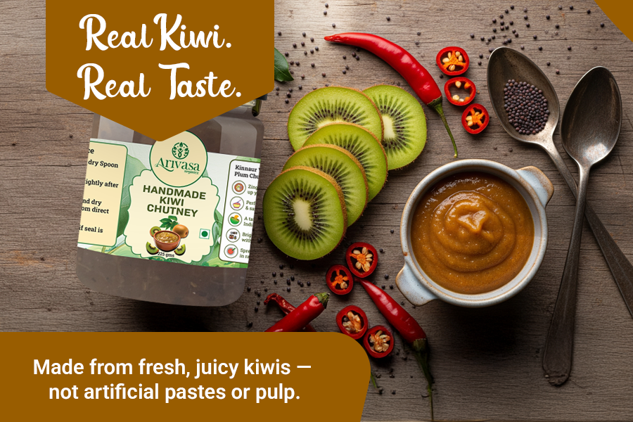 Discover the best taste of Arivasa Kiwi Chutney, handmade by women in the villages of Himachal with fresh, natural kiwis. Sweet, tangy, and naturally pure, this chutney is more than just a side dish. It’s a blast of Himalayan flavour that goes perfectly with your everyday meals and snacks. From parathas to sandwiches, wraps, or even golgappas,