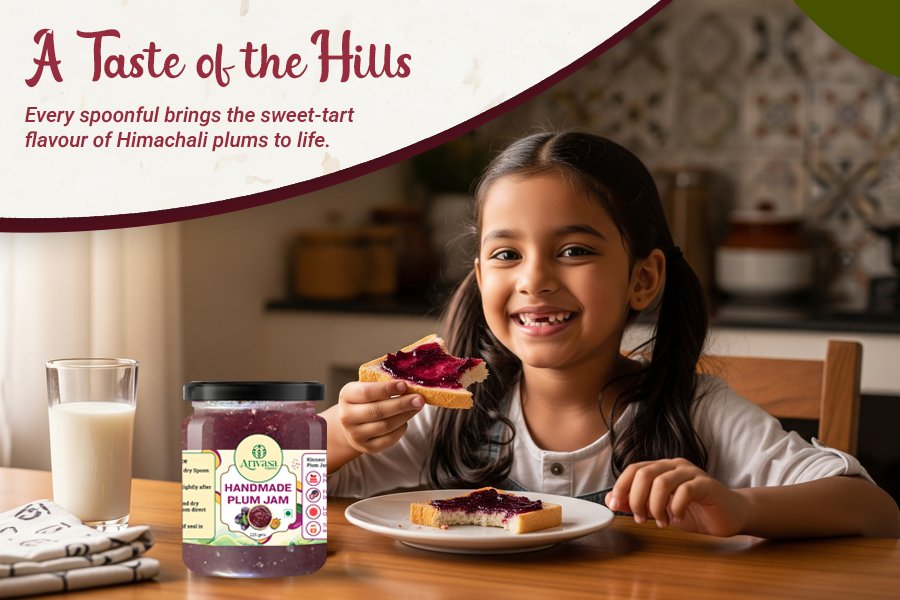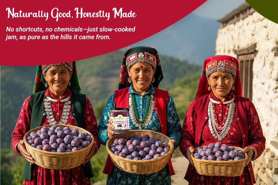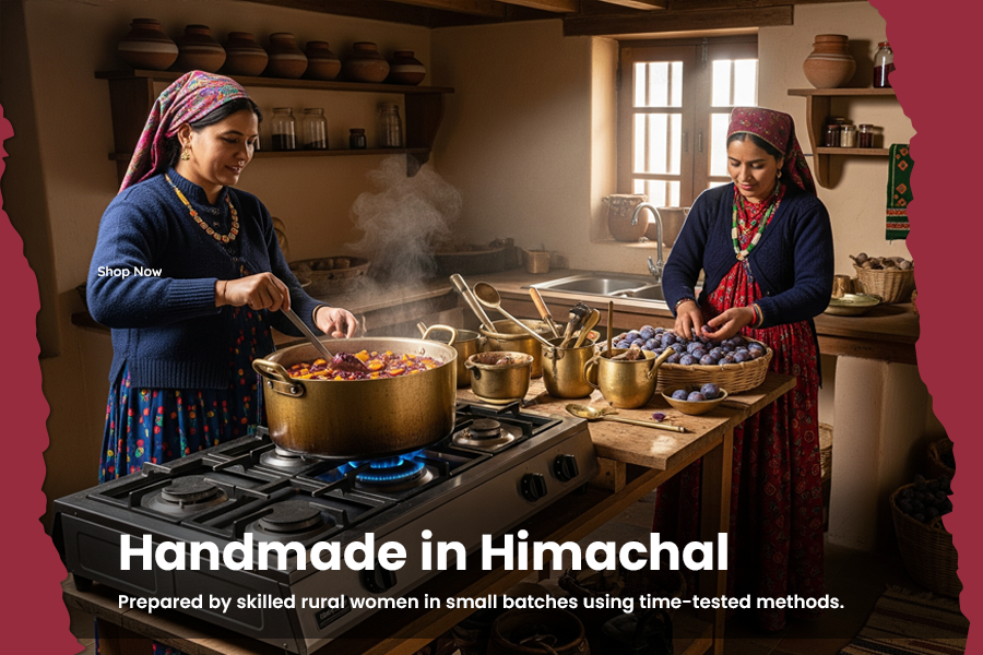 Hand-made Plum Jam from Himachal Pradesh made by Himachali Local village women using fresh, hand-picked plums. This jam marries the inherent tanginess of ripe plums with a soft sweetness, slow-cooked in small lots with traditional Himachali recipes.