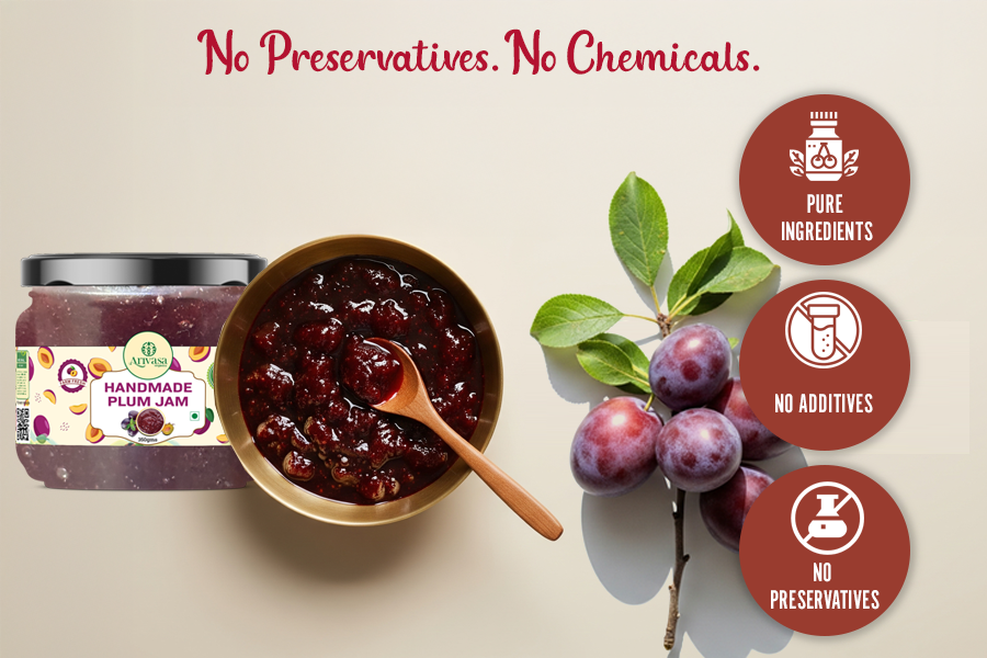 Unlike factory mass-based made jams loaded with artificial colour and preservatives Our plum jam is 100% natural, pure, and free of preservatives. Every jar is a testament to the love of women who make it with the same devotion they give their own families.
